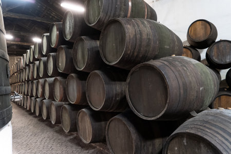Old porto lodge with rows of oak wooden casks for slow aging of fortified ruby or tawny porto wine in Vila Nova de Gaia, north of Portugal