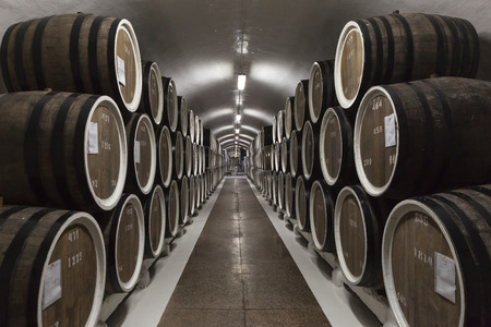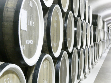 Wine cellar, row of wooden barrels