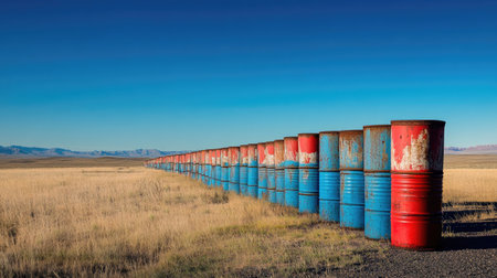 Blue and red oil barrels lined up next to each other under a clear blue sky in an open field.