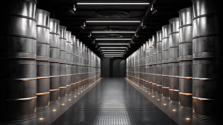 A spacious industrial storage room features rows of metallic barrels under sleek modern lighting, creating an organized and symmetrical environment.