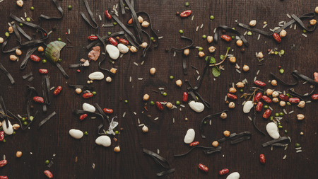 Different beans scattered on the table. Natural products on a dark background.