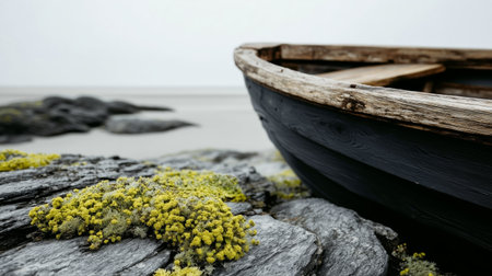 Fishing boat anchored on the sand of a dry beach. Quite rainy day with dense clouds.