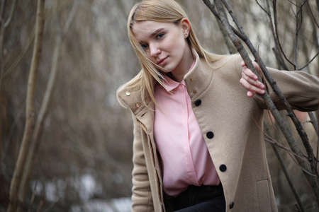 Beautiful girl in a beige coat and blue jeans in the winter forest