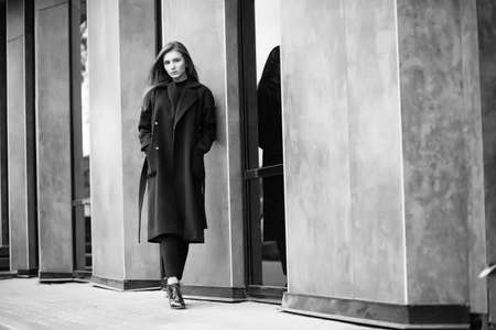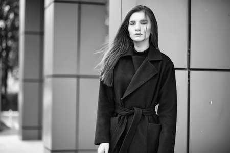Portrait of a young beautiful girl with chic long hair in an elegant autumn coat with a fashionable black handbag on the street near vintage buildings. Attractive stylish girl fashion model outdoors.