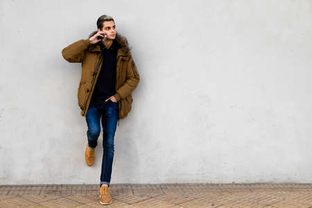 Fashionable young man in a brown coat holding headphones in front of an orange and brick wall