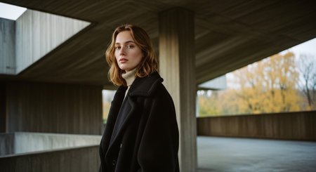 A model stands in a snowy corridor wearing a stylish oversized coat and layered clothing, with a serene expression, surrounded by large windows