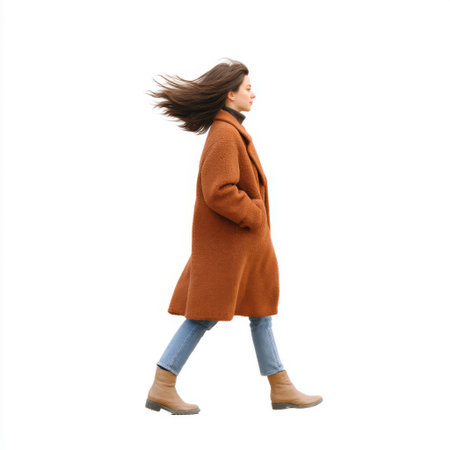 A woman walks confidently in a brown coat, her hair flowing with the wind. This stylish outdoor shot captures her dynamic movement against a white background, showcasing modern fashion and elegance.
