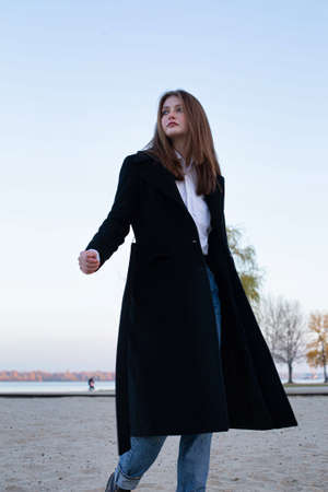 Walking long straight haired white european woman in dark coat in autumn on the beach