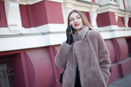 Young happy attractive fashion blonde woman dressed in fur coat talking on the phone in city