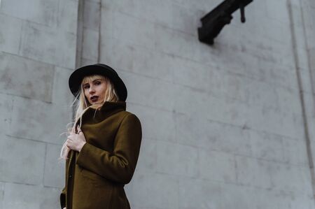 Beautiful elegant female model posing on the street wearing stylish gray winter coat and black turtleneck and wool fedora. Sexy woman looking away. fashionable street style