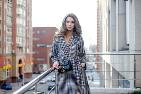 Beautiful model of an attractive young woman in a vintage checkered jacket with fur in a stylish knitted sweater stands in the city near a white striped wall.