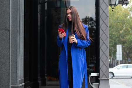 Portrait of the girl in the blue coat on the street, stylish outfit, woman fashion, street shooting