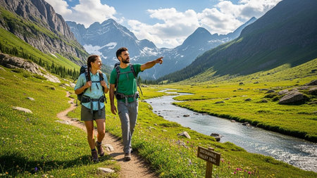 Two hikers enjoy a scenic trail walk in a lush, green valley surrounded by towering mountains and a winding river.