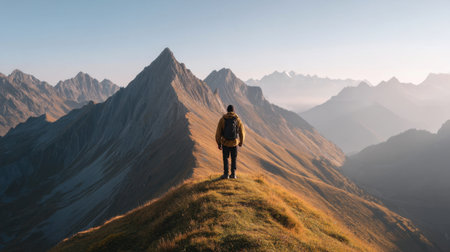 A solitary man stands on a mountain peak, enjoying a stunning vista of summer landscapes, vibrant colors, and dramatic mountain ranges, inspiring adventure and exploration.