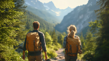 Back view of young couple with backpacks hiking in mountains. Man and woman hiking together.