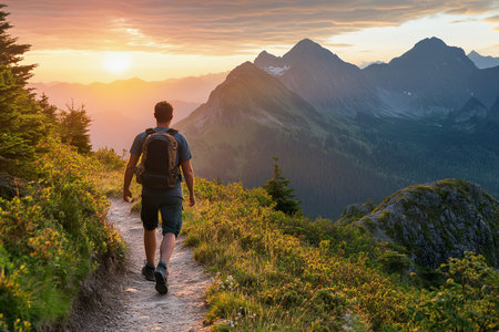male walks along a scenic mountain trail. Hiking at sunset
