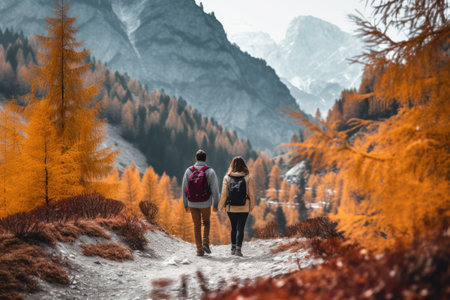 Enjoying the travel Rear view of modern young couple holding hands and moving up while hiking together in the woods : Generative AI