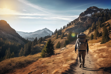 Hike in the mountains. A man with a backpack travels along the trail. generative ai