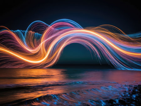 Streams of vibrant light carve through the twilight, capturing the relentless flow of data and energy. On a wet coastal road, abstract swirls and high-speed trails create a visual metaphor for innovation, progress, and the dynamic pulse of modern technology.