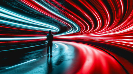 Person in a dynamic sci-fi tunnel with red and blue light trails, futuristic atmosphere.