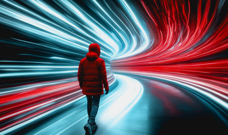 Person in red jacket in futuristic tunnel with dynamic red and blue light trails.