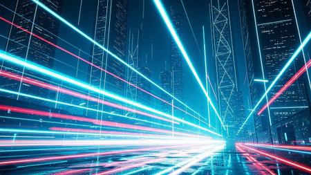 Futuristic cityscape featuring glowing lasers, fluorescent skyscrapers, and autonomous vehicles
