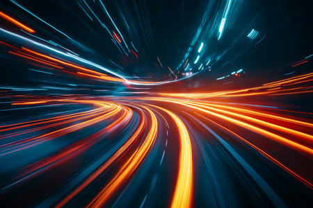 Vibrant light trails create an abstract representation of speed and motion at night, showcasing the dynamic energy of urban environments in a captivating visual display.