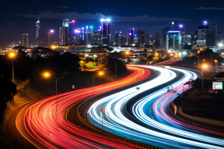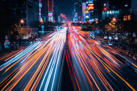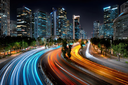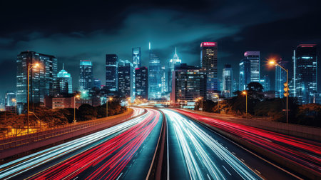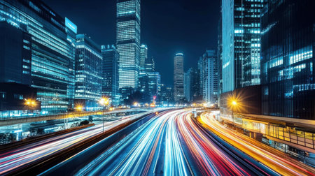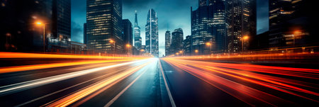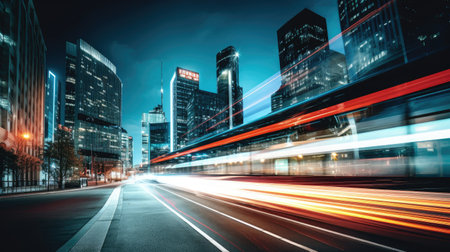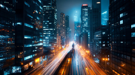 Captivating night urban scene showcasing dynamic motion blur of fast moving traffic against the backdrop of illuminated skyscrapers and city lights.