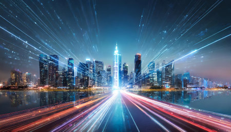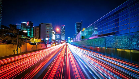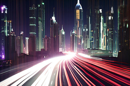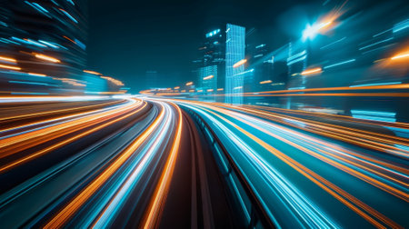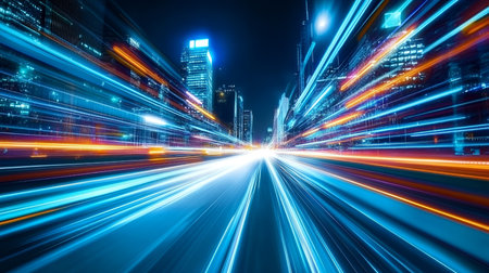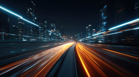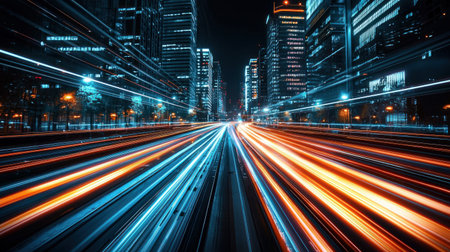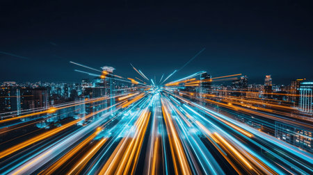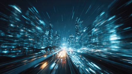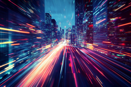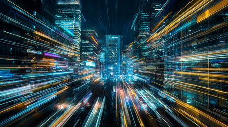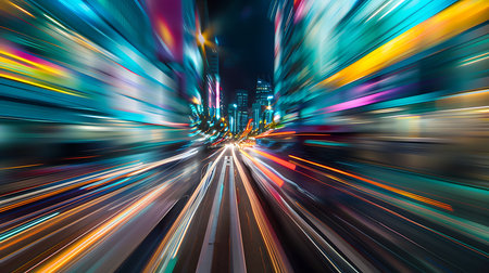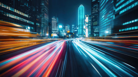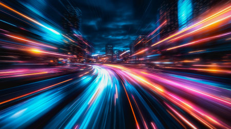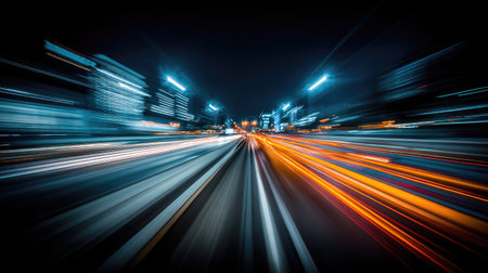 A stunning night view of an urban landscape showcasing vibrant city lights with motion blur, illustrating speed and energy in a modern metropolis.