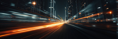 This image captures a dynamic, abstract scene of a highway at night. Streaks of light, in shades of orange and blue, create a sense of speed and movement. The composition features a blurred foreground with lights suggesting vehicles on the road, against a backdrop that evokes a metropolitan area, perfect for various commercial or editorial uses.