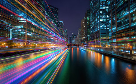 This nighttime view features a city skyline with tall buildings and a river. The scene is dominated by colorful light trails, possibly from moving vehicles or light sources. The composition uses a low angle, emphasizing the city's vertical structures. This image could be used for various commercial or editorial purposes, conveying a sense of urban energy.