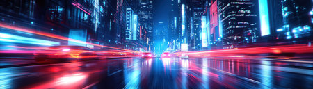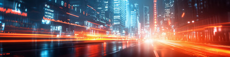 This image portrays vibrant speed light trails coursing through the streets of a smart, futuristic mega-city. Neon-lit skyscrapers dominate the scene, showcasing innovation and the ceaseless