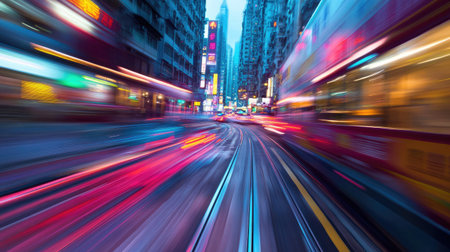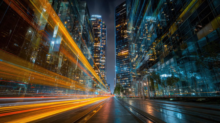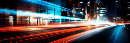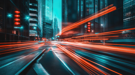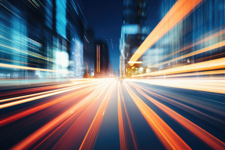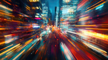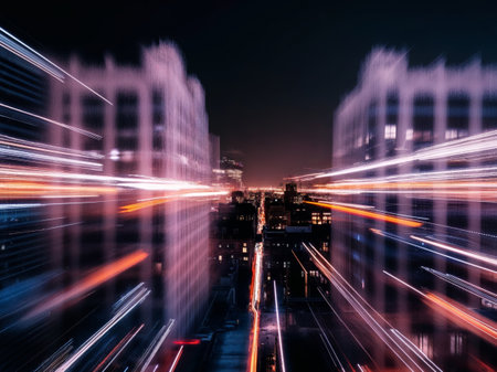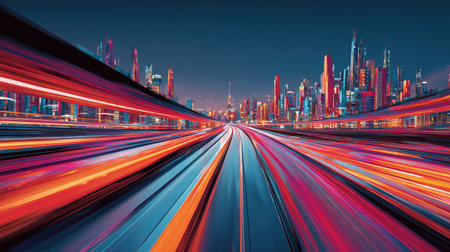 An abstract cityscape featuring light trails creates a sense of speed and motion, capturing the dynamic energy of urban life and modern transportation at night.