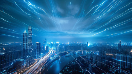 An urban landscape features towering buildings interconnected by streaks of light. The composition highlights a sense of speed and technological advancement, with streams of red and white light traversing the scene. The image suggests a futuristic setting with possible uses in technology-related projects and commercial designs.