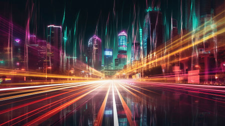 Abstract cityscape featuring neon light trails and dynamic motion effects, offering a futuristic and energetic urban scene. -
