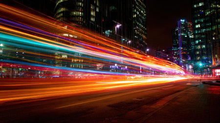 Vibrant light trails streaking through cityscape at night