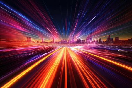 Futuristic city with fast-paced light motion in vibrant skyline