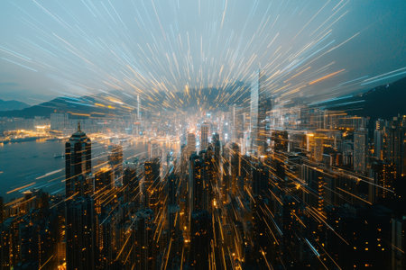 cityscape with rays of light, expressing the fast life in the city generative ai