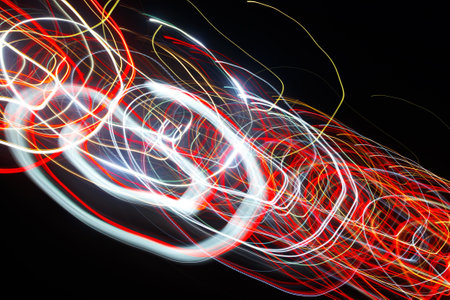 This captivating image features dynamic light trails in red and blue, showcasing energy and movement. The abstract patterns provide a modern, artistic feel, perfect for creative projects.