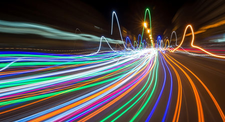 Colorful light trails in motion, vibrant neon streaks creating an energetic and dynamic abstract background