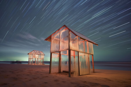 Tranquil sea under star tracks, starlight tracks under night