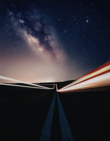 Generative AI : Night sky with milky way and stars Night road illuminated by car Light trails