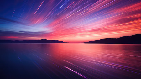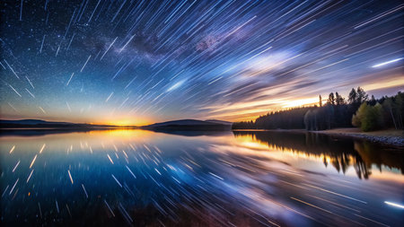 Bright streaks cross a starry sky above a tranquil landscape during twilight