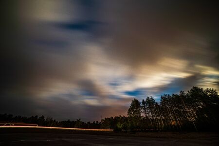 Milky Way over the highway at night. Long exposure photo.