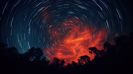 Generative AI : Long exposure star trails in the night sky against the background of tree crowns in the forest