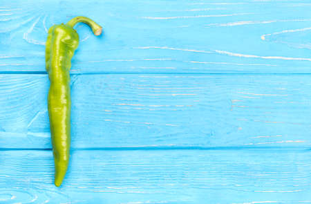 Fresh green chili peppers on a blank blue table