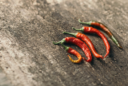 Red and green hot chili peppers on a rustic wooden background.