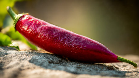 Vibrant red chili pepper laying on rough textured surface basking in soft light