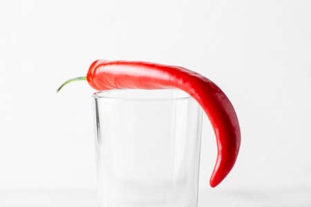 Red hot chili peppers in a glass on a white wooden background. The concept of spicy food, drinks.