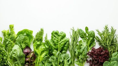 Farm to table abundance concept. Different types of fresh green vegetables and green herbs on white background copy space. Health, vitamins and healthy lifestyle. Generative ai.